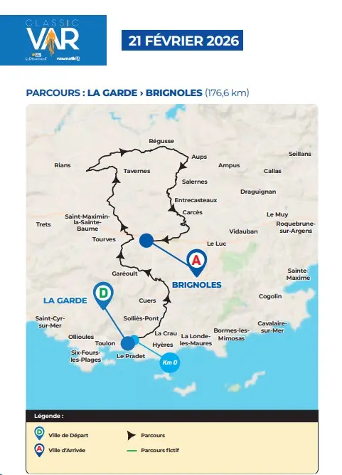 Classic Var : départ de la Garde, 176.6km à travers le département pour une arrivée à Brignoles. 119 coureurs présents dans le peloton; village animation, diffusion de la course sur écran géant, caravane publicitaire présente sur la course