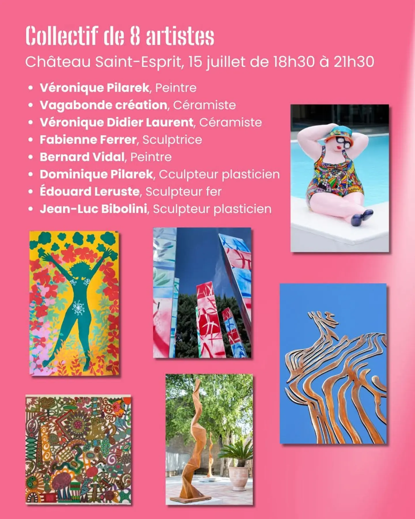 Au Château Saint-Esprit tous les lieux sont investis avec Véronique Pilarek (peintre) - Vagabonde création (céramiste) - Véronique Didier Laurent (céramiste) - Fabienne Ferrer (sculptrice) - Bernard Vidal (peintre) - Dominique Pilarek (sculpteur- plasticien) - Édouard Leruste (sculpteur fer) et Jean-Luc Bibolini (sculpteur-plasticien).