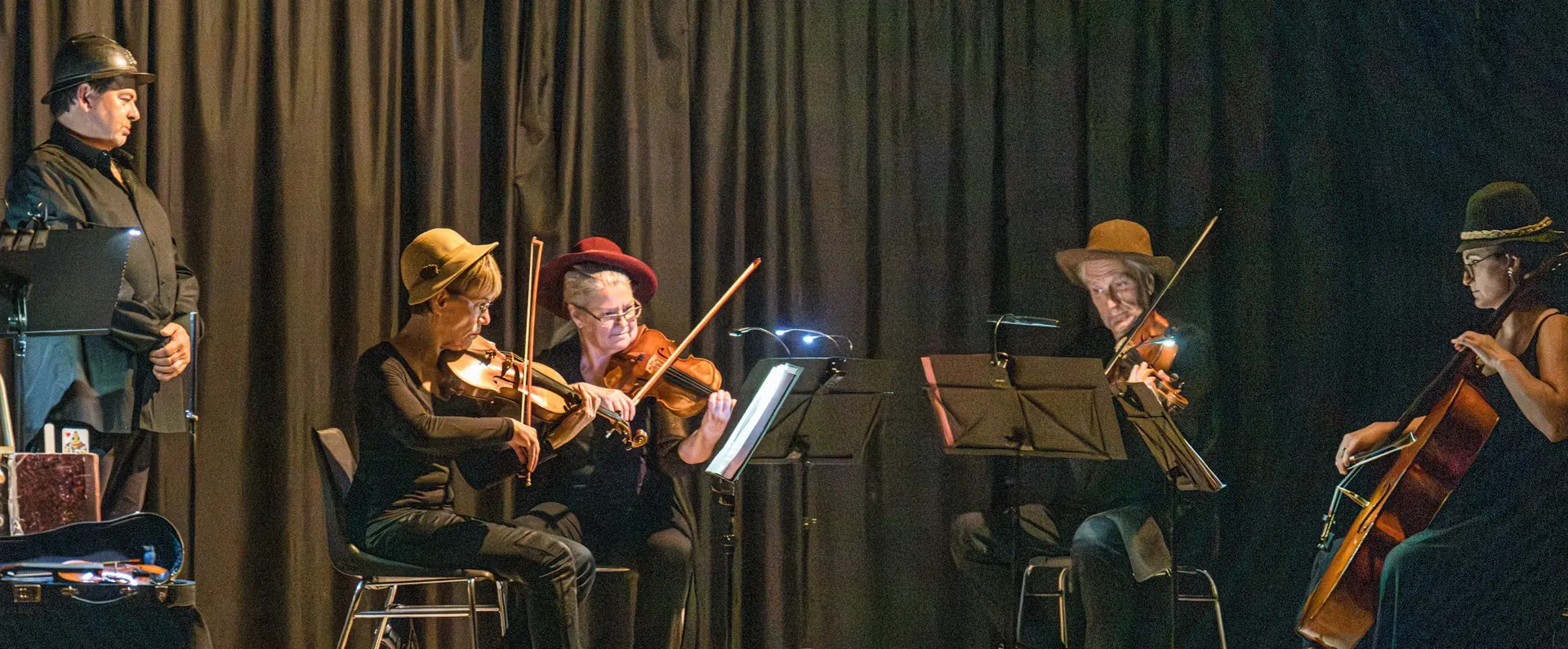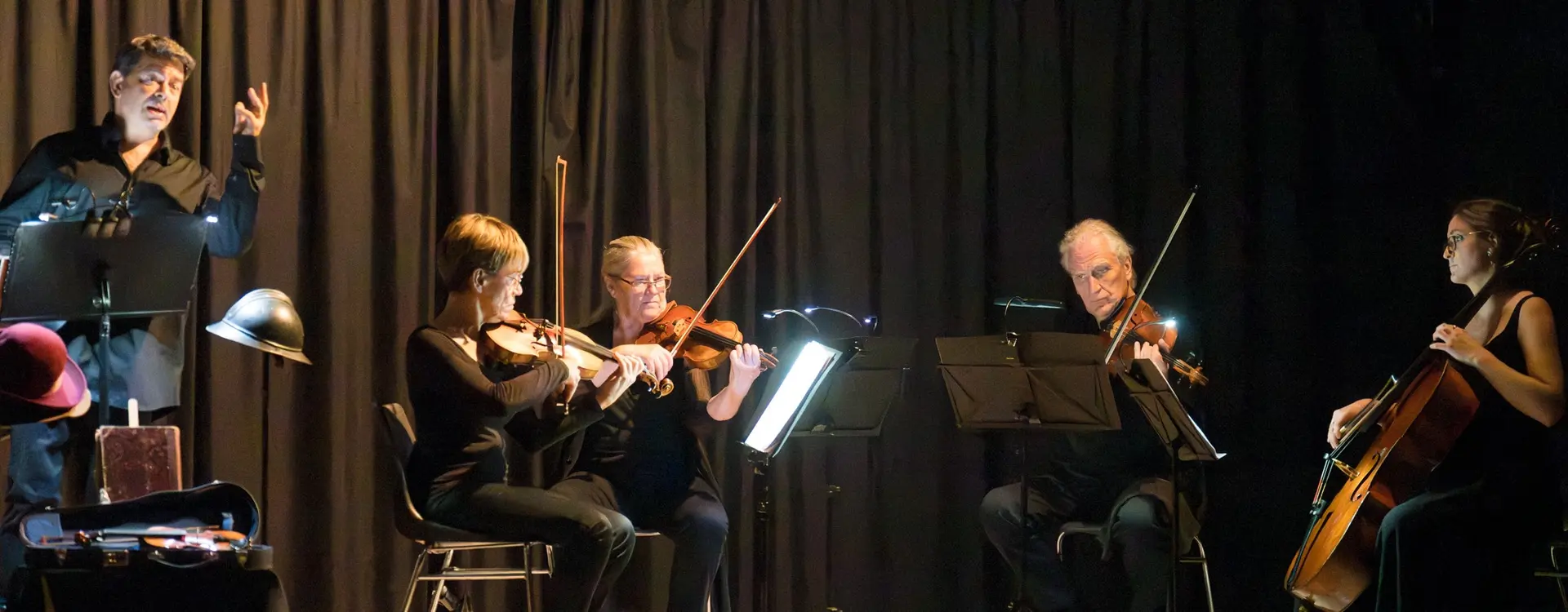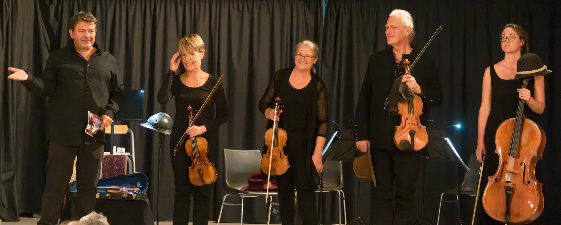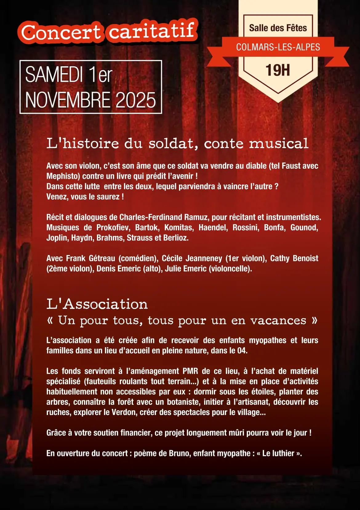 Récit et dialogue de Charles-Ferdinand RAMUZ pour récitant et instrumentistes . Musique de PROKOFIEV, BARTOK, KOMITAS, HAENDEL, ROSSINI, BONFA, GOUNOD, JOPLIN, HAYDN, BRAHMS, STRAUSS, BERLIOZ. Avec Frank Gétreau (comédien), Cécile Jeanneney (1er violon), Cathy Benoist (2d violon), Denis Émeric (alto) et Julie Émeric (violoncelle)
