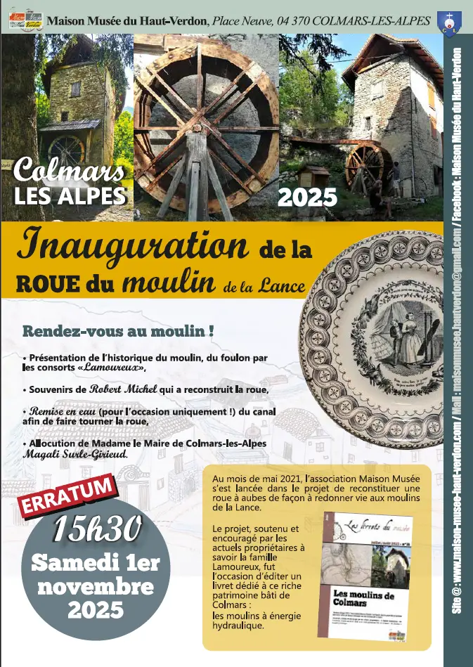 Inauguration de la roue du moulin de la Lance à Colmars-les-Alpes : présentation de l’histoire du moulin par les consorts Lamoureux, souvenirs de Robert Michel, remise en eau exceptionnelle du canal et allocution de Madame le Maire.