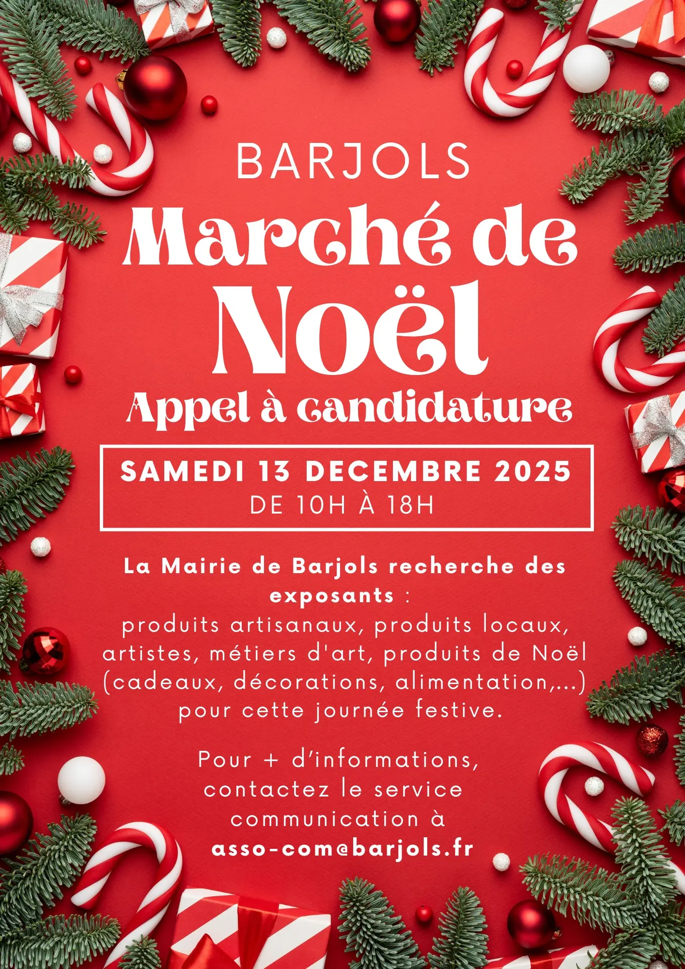 A cette occasion, la Mairie de Barjols recherche des exposants : produits artisanaux, produits locaux, artistes, métiers d'art, produits de Noël (cadeaux, décorations, alimentation,...) pour cette journée festive. Vous souhaitez participer au marché de noël, contactez nous par mail à asso-com@barjols.fr