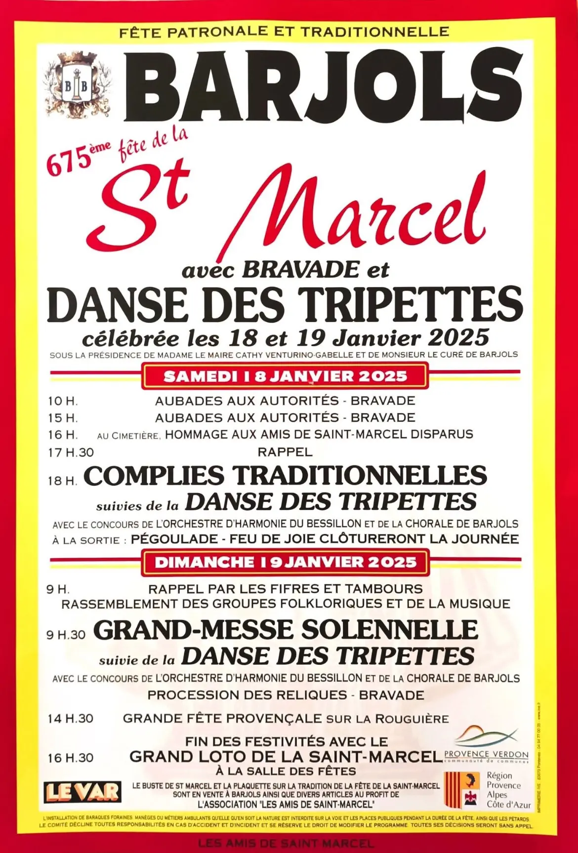 La fête de la Saint Marcel commémore l'arrivée dans le village des reliques du Saint protecteur de la cité ainsi que les tripes d'un bœuf ayant sauvé Barjols de la famine. Pour sa 676ème édition nous assisterons à une petite Saint-Marcel (sans le bœuf).