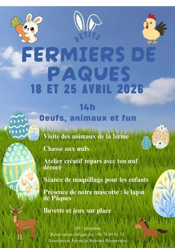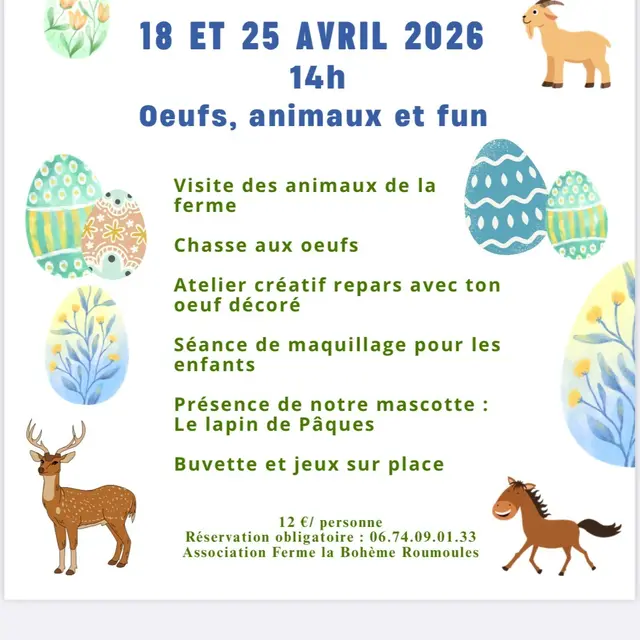 Pâque à la ferme , Venez passer un moment fun et convivial à la ferme Visite guidée Chasse au œufs Atelier créatif décoration d’œuf Séance maquillage pour enfants Présence de notre mascotte le lapin de Pâques Réservation au 0674090133