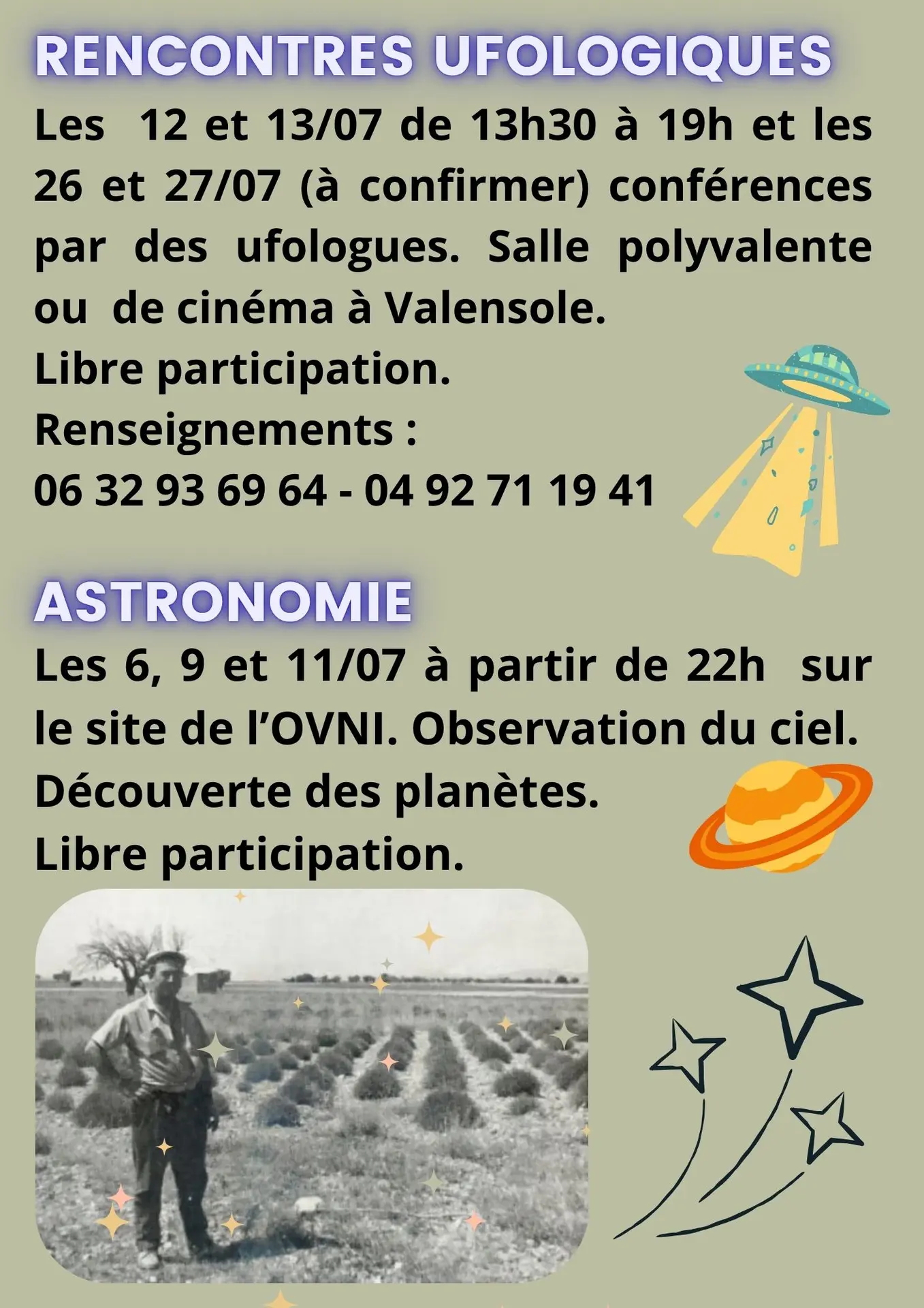 Le 12 et 13 juillet de 13h00 à 19h00 et les 26 et 27 juillet (à confirmer) Conférences par des ufologues. Salle polyvalente ou cinéma à Valensole - Participation libre - renseignement : 06 32 93 69 64 - 04 92 71 19 41