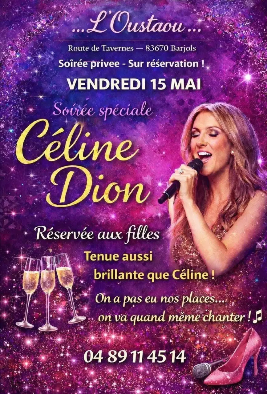 Faute de place au concert profitez de la soirée Céline Dion de l'oustaou pour fredonner vos hits préférés de Céline Dion. Soirée privée sur réservations.