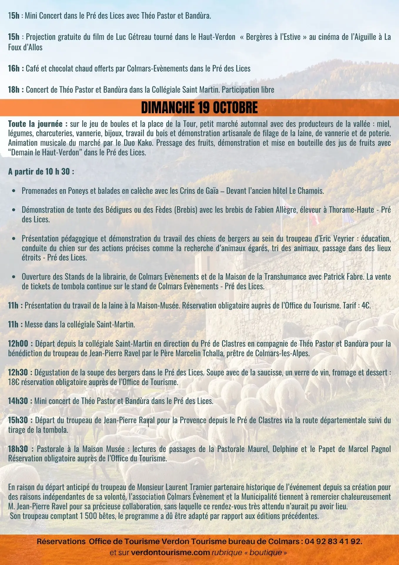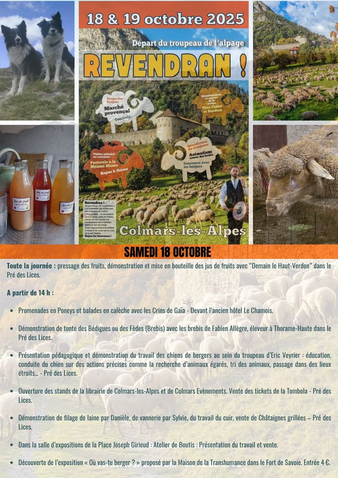 Revendran est un évènement autour de la descente des alpages des troupeaux ovins. Accompagnement du troupeau, rencontre avec les bergers, démonstrations, animations pédagogiques, expositions, spectacles de rues en musique, artisanat et soupe des bergers.