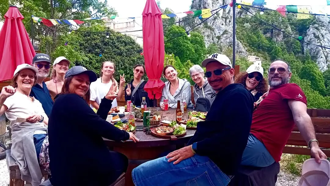 Snack, buvette, petite restauration maison : bruschettas, planches, salades et plats faits maison, bière artisanale et locale sur une terrasse avec très belle vue sur les gorges du Verdon, en plein air et ombragée. Service non-stop.